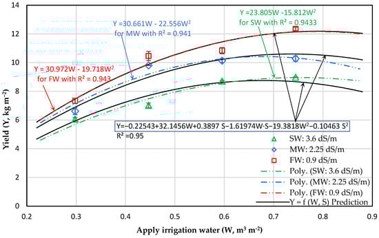 Furthermore, a second-order polynomial two independent variables (W and S) relationship that integrates water amount (W, m³ m−2) and salinity (S, dS m−1) for tomato yield prediction (Y, kg m−2) was formed using the Statistix 9 software [45] as