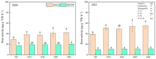 As shown in Figure 1, the cultivar and N treatment had an obvious influence on peanut root activity, and the interaction of year and cultivar and cultivar and nitrogen treatment can significantly impact the peanut root activity. The growth and metabolic level of roots, that is, root activity, is one of the important physiological indicators of plant growth. Plants with strong root activity can better absorb water and nutrients in the soil and provide sufficient nutrient supply. Nitrogen fertilizer application improved root activity over the two years. For the HY22 in 2020 and 2021, higher root activity levels were evident under N15 treatment conditions (31.43% and 30.39% above N0), with no increases as N concentrations were further increased. There were no obvious differences in root activity for the HY39 cultivar among the N15, N30, and N45 treatment conditions over the two years, with increases of 11.72%, 8.69%, and 10.4% in 2020, respectively, and 15.03%, 16.19, and 17.85% in 2021, respectively, compared with the N0. These findings suggested that under N15 treatment conditions, the peanut seedling root system exhibits more vigorous activity and exhibits a higher capacity to engage in nutrient absorption.