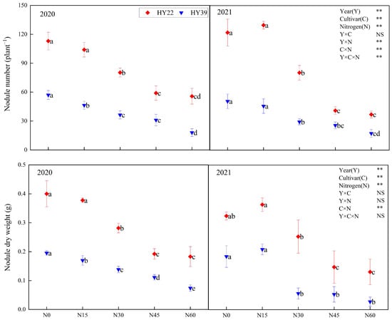 As shown in Figure 2, Analysis of variance (ANOVA) showed that year, cultivar, N treatment, and the interaction of cultivar and N treatment obviously impacted the nodule number and dry weight, whereas the interaction among the year and cultivar had nonsignificant effects. Root nodule numbers and dry weight showed a continuous decreasing trend with increasing N input in both years. From 2020 to 2021, N30, N45, and N60 treatments reduced the nodule number and dry weight by 28.91–68.42% and 29.2–62.07%, respectively, among the 2 cultivars compared with N0. Compared with other nitrogen treatments, N15 treatment significantly increased the nodule number and dry weight, but it was not significantly different from N0. Nitrogen application higher than N15 had a significant inhibitory effect on the peanut nodulation ability, and the higher the nitrogen level, the stronger the inhibitory effect. So N15 treatment had stronger nodulation ability in both varieties.
