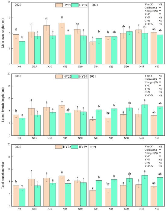 Analysis of variance (ANOVA) showed that cultivars and N treatment had obvious influence on the main stem height, total branch number, main stem nod number, and main stem green leaves, whereas the interaction among the year and N treatment had nonsignificant effects. For both experimented peanut cultivars, initial nitrogen application strongly accelerated the growth of the peanut (Figure 3). Nitrogen inputs to both varieties significantly increased the main stem height, total branch number, main stem nods number, and main stem green leaves. The HY22 cultivar with the N45 treatment increased the main stem height, main stem nod number, and main stem green leaves compared with other treatments during 2020 to 2021. For HY39, nitrogen fertilizer inputs did not significantly increase the main stem nod number and main stem green leaves. However, the lateral branch length under N30, N45, and N60 was significantly higher than in the other treatments during both years.