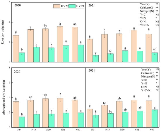 Analysis of variance (ANOVA) showed that year, cultivars, and N treatment had obvious effects on root dry weight, while interaction among the year and N treatment had significant effects. It was clear that the maximum root dry weight in the large-grain HY22 peanut cultivar was N45 conditions over both years and in the order of N45 > N60 > N30 > N15 > N0 in 2020 (Figure 4). The root dry weight of the small-grain HY39 cultivar was significantly decreased under the N0 treatment relative to other treatments in 2020. In the 2021 growing season, the root dry weight under the N30 and N45 treatments was obviously higher compared to the other treatments. Root growth inevitably influences aboveground plant growth. As shown in Figure 4, the aboveground dry weight of these two peanut cultivars rose continuously with increasing nitrogen application to a peak value under the N45 treatment of the HY22 cultivar and under the N60 treatment of the HY39 cultivar.