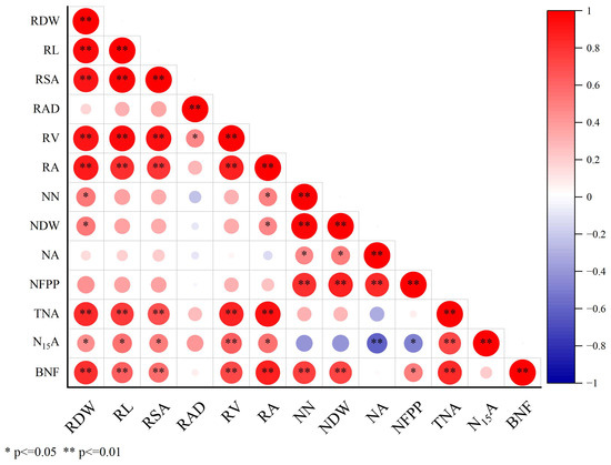 Pearson correlations for key indexes. RDW, root dry weight; RL, root length; RV, root volume; RSA, root surface area; RAD, root average diameter; RA, root activity; NN, nodule number; NA, nitrogenase activity; NDW, nodule dry weight; TNA, total nitrogen accumulation; N15A, 15N absorption; BNF, biological nitrogen fixation; NFPP, nitrogen fixation potential per plant. * and ** are significant at the 0.05 and 0.01 levels.