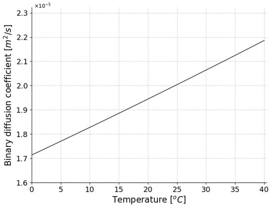 The temperature-dependent binary diffusion coefficient ( [m/s]) for nitrogen and oxygen is calculated based on the equation provided by Bird et al. []: