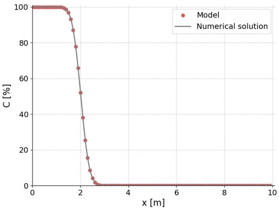 The authors compared the model results with the solution provided by Zoppou and Knight [] (Equation (5)) when [m s], [m], [%] at [s]. The results are shown in Figure 2. It is evident that the model accurately solves the equation, aligning closely with the numerical solution. Notably, the Mean Absolute Error was calculated to be 0.02987.