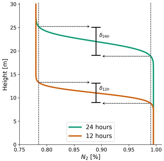 The study of nitrogen distribution draws parallels to the analysis of thermoclines in hot water storage tanks during charging, as observed by Kaloudis et al. [] and Kaloudis et al. []. Although the physical phenomena involve distinct fluid viscosities (nitrogen gas vs. water), the similarities in convection and diffusion make certain parameters applicable. For our study, the term “thermocline thickness” [] is adapted to represent the diffusion layer’s thickness. Figure 4 illustrates that, at 12 h, the diffusion layer’s thickness was (12 h) = 4.49 m, while at 24 h, (24 h) = 6.35 m, consistent with the observations of Kaloudis et al. []. This alignment signifies the anticipated increase in the diffusion layer’s thickness over time.