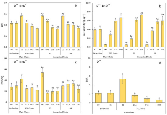 All treatments after application of FGD gypsum with humic acid led to a significant decrease in pH, ESP, and SAR (p < 0.05; see Figure 1a,c,d) while significantly increasing soil salinity (p < 0.05; see Figure 1b). The application of FGD gypsum with humic acid combined with biofertilizer showed significant interaction effects on pH, ESP, and soil salinity (p < 0.05; see Figure 1a–c). The application of FGD gypsum with humic acid combined with biofertilizer led to a significant interaction effect between soil salinity and ESP at D7.5 and a significant interaction effect between pH and ESP at D15.