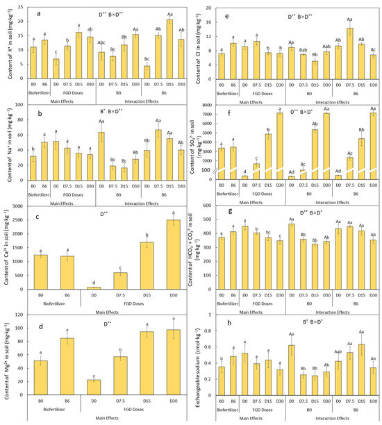 Effects of restoration strategies on the content of water-soluble ions. (a) contents of K+ in soil (b) contents of Na+ in soil (c) contents of Ca2+ in soil (d) contents of Mg2+ in soil (e) contents of Cl− in soil (f) contents of SO42− in soil (g) contents of HCO3− + CO32− in soil (h) exchangeable sodium (ES) in soil. Note: B0 and B6 indicate the treatments applied Bio-fertilizer with 0 g·kg−1 and 6.0 g·kg−1. D0, D7.5, D15, D30 indicate the treatments applied FGD gypsum + Humic acid with 0 g·kg−1, 7.5 + 0.75 g·kg−1, 15.0 + 1.5 g·kg−1, 30.0 + 3.0 g·kg−1, respectively. Different lowercase letters represent the significant difference between levels of each treatment factor and between FGD doses in each level of biofertilizer, and different uppercase letters represent the significant difference between levels of biofertilizer in each level of FGD doses (p < 0.05). * indicates significant difference at 0.05 level. ** indicates significant difference at 0.01 level.
