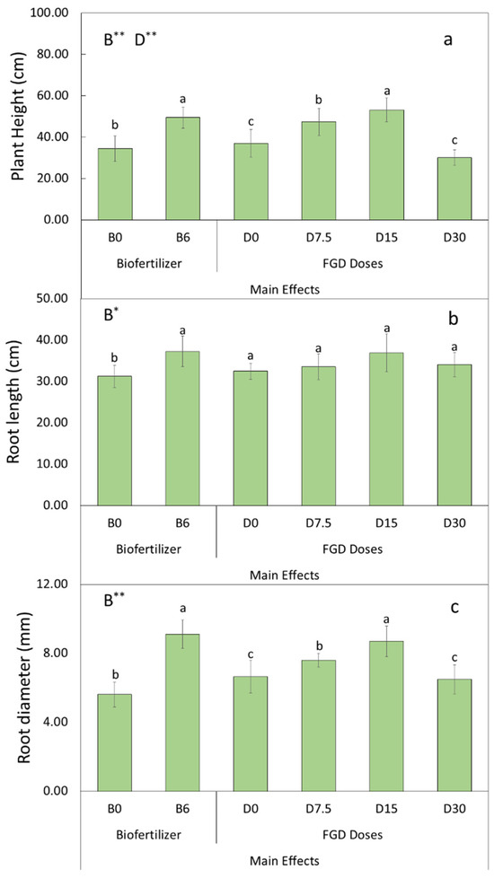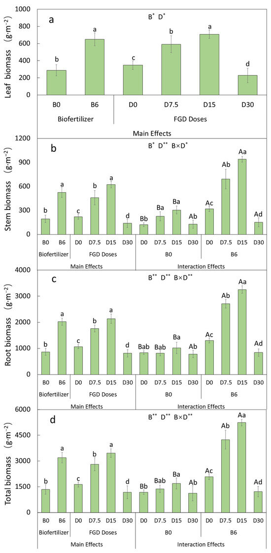 The application of bio-fertilizers significantly enhanced plant height, root length, and root diameter (p < 0.05; see Figure 3), along with the biomass of each organ, as well as the overall biomass, of M. sativa plants (p < 0.05; see Figure 4). As for the biomass of each organ and total biomass displayed significant variations under different applications of FGD gypsum with humic acid, D15 was highest (p < 0.05; see Figure 4). The application of FGD gypsum with humic acid combined with biofertilizer showed a significant interaction effect on stem biomass, root biomass, and total biomass. The combination led to a significant increase in the stem biomass, root biomass, and total biomass at D7.5 and D15 (p < 0.05; see Figure 4b–d).