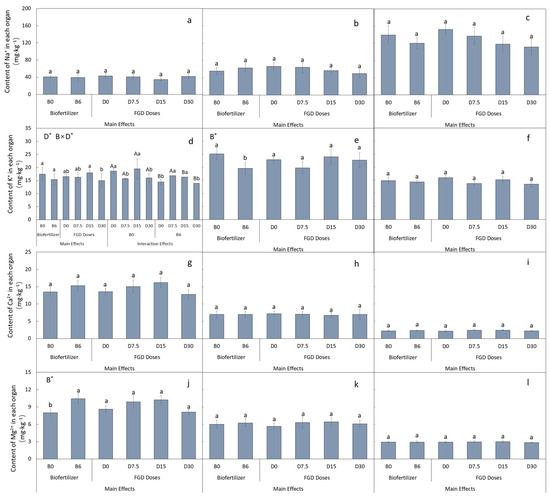 Leaf K+ levels were notably affected by the doses of FGD gypsum with humic acid. Additionally, the application of bio-fertilizer significantly increased leaf Mg2+ while decreasing stem K+ (see Figure 5). The application of FGD gypsum with humic acid combined with biofertilizer showed a significant interaction effect on the content of K+ in the leaf (p < 0.05; see Figure 5).
