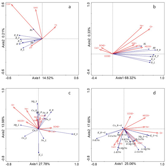 RDA analysis of plant growth, ion partitioning, transport, and soil environmental factors under different remediation measures (a) effect of soil salinity- alkalinity properties on plant growth and yield (b) effect of soil water-soluble cations on plant growth and yield (c) effect of soil water-soluble cations on contents of ions in plant (d) effect of soil water-soluble cations on transportation of ions in plant. TS: soil solidity, B-L, B-S, B-R, B-T: biomass of leaf, stem, and root, respectively. Na_L, K_L, Ca_L, Mg-L were content of Na+, K+, Ca2+, Mg2+ in leaf; Na_S, K_S, Ca_S, Mg-S: content of Na+, K+, Ca2+, Mg2+ in stem, Na_R, K_R, Ca_R, Mg_R: content of Na+, K+, Ca2+, Mg2+ in root, respectively. L_K/Na, L_Ca/Na, L_Mg/Na were K+/Na+, Ca+/Na+, Mg+/Na+ of leaf, S_K/Na, S_Ca/Na, S_Mg/Na were K+/Na+, Ca+/Na+, Mg+/Na+ of stem, R_K/Na, R_Ca/Na, R_Mg/Na were K+/Na+, Ca+/Na+, Mg+/Na+ of root, respectively. K_R→S, Ca_R→S, Mg_R→S: transport selectivity ratio of K+, Ca2+, Mg2+ from root to stem, K_S→L, Ca_S→L, Mg_S→L: transport selectivity ratio of K+, Ca2+, Mg2+ from stem to leaf.