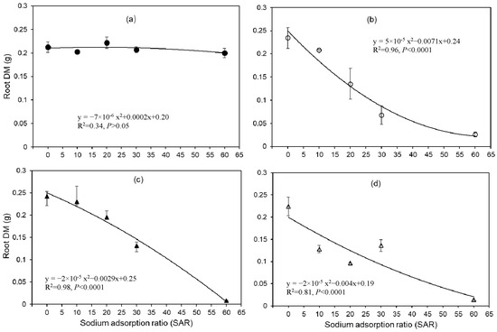 Root dry matter (DM) of four wheat genotypes [(a) EGA Gregory, (b) Spitfire, (c) Ventura, and (d) Baxter] under varying SAR treatments. The bars represent the standard errors calculated from four replicates of each genotype.