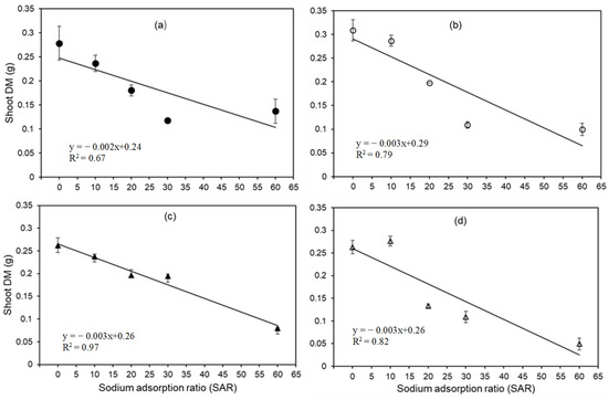 An evident decrease in the shoot DM was observed for all four genotypes with an increasing SAR (see Figure 3). Initially, at SAR 0, the shoot DM of the four genotypes ranged from 0.26 to 0.31 g. However, at SAR 60, this range reduced notably to 0.04–0.13 g (Figure 3).