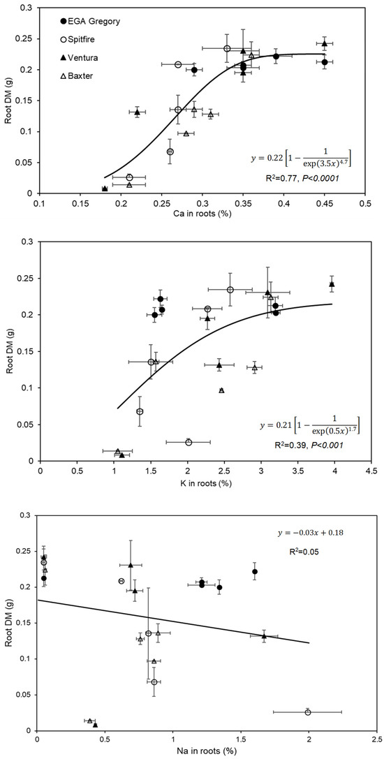 Relationship between the root dry matter (DM) and concentrations of Ca (R2 = 0.77), K (R2 = 0.39), and Na (R2 = 0.05) in the root tissues of four wheat genotypes across four replicates grown in five SAR treatments. The horizontal bars represent the standard error of Ca, K, and Na concentrations in roots, respectively, while the vertical bars denote the standard error of the root DM. The relationship between the root DM and Na concentration in the roots was not found to be statistically significant (p > 0.05).