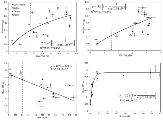 Root and shoot DM and their relationship with Ca, Na, and K were analyzed using regression analysis, fitting either polynomial, linear curves or curves of the general form, using Equation (2):