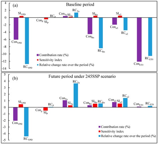 In the future period, VPD also showed the largest contribution rates with −2.0% and 4.4% to ET0 change under the SSP245 and SSP585 scenarios, respectively. Like for the baseline period, VPD showed the largest decrease rate over the period under the SSP245 and SSP585 scenarios but was not the most sensitive climatic variable to ET0 change. Ta was the second largest contribution factor to ET0 change in the future period under the SSP245 and SSP585 scenarios. Like for the baseline period, the absolute values of RC of those variables having larger contributions were far higher than the absolute values of SI of the variables in the future period, such as VPD, Ta and u2 (Figure 10b,c).