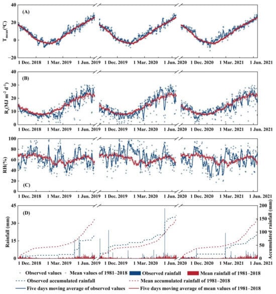 Daily mean temperature (Tmean), solar radiation (Rs), relative humidity (RH), and rainfall in the 2018–2019, 2019–2020 and 2020–2021 wheat seasons and the corresponding average data over 1981–2018. Subfigures (A–D) represent the Tmean, Rs, RH, and rainfall, respectively.