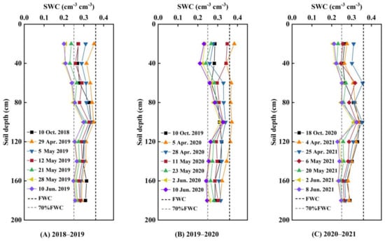 Variation in soil water content (SWC) in the 0–180 cm soil layer in the wheat seasons of 2018–2019 (A), 2019–2020 (B), and 2020–2021 (C). FWC represents the mean field water capacity.