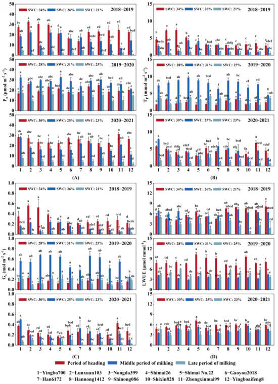 Gas exchange parameters of flag leaves for the 12 wheat varieties in the heading and middle and late grain-filling stages in the 2018–2021 wheat seasons. Subfigures (A–D) represent the net photosynthesis rate (Pn), transpiration rate (Tr), stomatal conductivity (Gs) and water productivity at the leaf level (LWUE), respectively, in the three seasons. Different letters indicate significant differences at the 0.05 level between wheat varieties at the same growth stage.