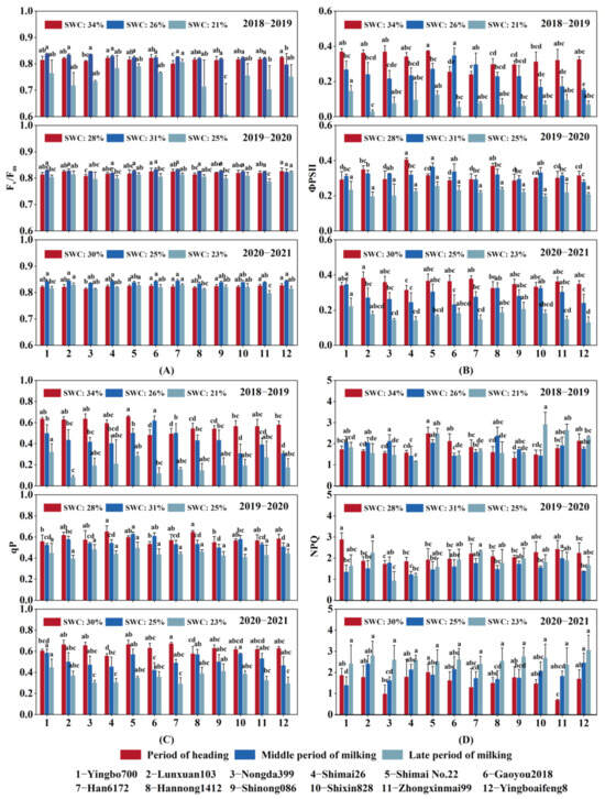 The fluorescence parameters of Fv/Fm, ΦPSII, qP, and NPQ of flag leaves for the 12 wheat varieties at the heading and middle and late grain-filling stages in the 2018–2021 wheat seasons are presented in Figure 5. The differences in Fv/Fm among all wheat varieties were relatively small at the heading and middle grain-filling stages, with values of approximately 0.80. However, the Fv/Fm at the late grain-filling stage was between 0.60 and 0.81 in the 2018–2019 season and approximately 0.80 in the 2019–2020 and 2020–2021 seasons. Among the 12 varieties at the late grain-filling stage in the 2018–2019 season, Han6172, Shimai26, and Shimai No. 22 had higher Fv/Fm values of approximately 0.80, while Shinong086, Hannong1412, and Zhongxinmai99 had lower values of 0.61, 0.71, and 0.70, respectively. This result indicates that the potential stress resistance of the first three wheat varieties was relatively high, while that of the last three varieties was relatively low. The variation in ΦPSII in different varieties was closely related to SWC, where a higher SWC generally resulted in ΦPSII.