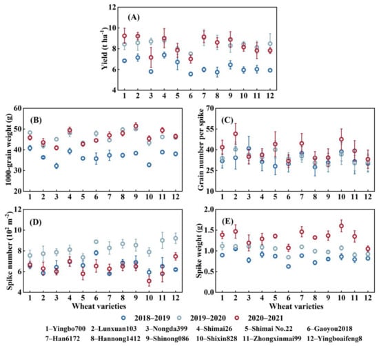 The wheat grain yields (A) and the four yield factors of the 12 wheat varieties in the 2018–2019, 2019–2020, and 2020–2021 wheat seasons. Subfigures (B–E) represent the variations in 1000-grain weight, grain number per spike, spike number in a square meter and spike weight, respectively.