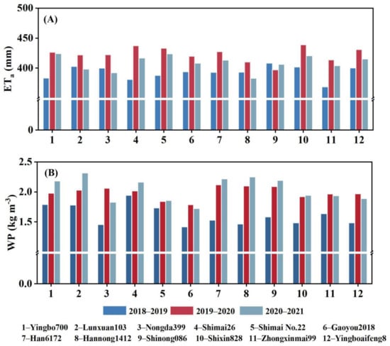 Actual crop evapotranspiration ETa (A) and water productivity WP (B) of the 12 wheat varieties in the 2018–2019, 2019–2020 and 2020–2021 wheat seasons.