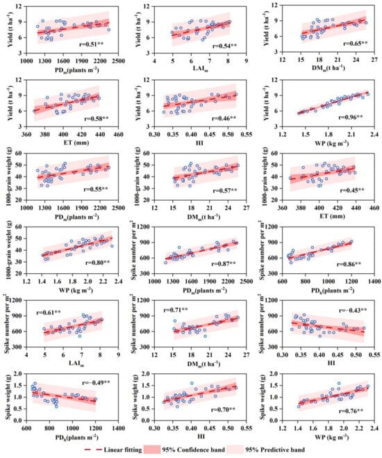 The correlation coefficients between grain yield and growth indicators of the 12 wheat varieties in the three wheat seasons are shown in Table 4, and Figure 8 shows the relationship between them at the significance level of 0.01. The yield grain was significantly positively correlated with PDm, LAIm, DMm, ETa, HI, and WP at the level of 0.01, with correlation coefficients of 0.51, 0.54, 0.65, 0.58, 0.46, and 0.96, respectively. The high-yield wheat varieties generally had a greater PDm, LAIm, DMm, ETa, HI, and WP. At the significance level of 0.01, the 1000-grain weight of different varieties showed a positive correlation with PDm, DMm, ETa, and WP, the spike number per m2 showed a positive correlation with PDm, PDh, LAIm, and DMm and a negative correlation with HI, and the spike weight was negatively correlated with PDh and positively correlated with HI and WP.