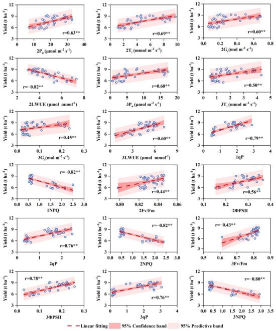 Relationship between yield and physiological parameters at different growth stages for the 12 wheat varieties in the 2018−2021 seasons at the significance level of 0.01. Note: ** indicates a significance level of 0.01. The numbers 1, 2, and 3 before the photosynthetic parameters represent the parameters measured in the heading and the middle and later grain-filling stages, respectively.