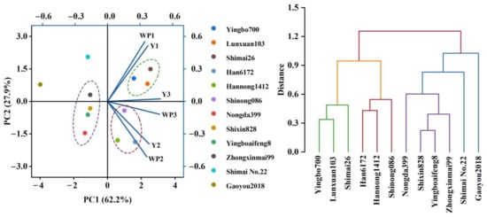 Principal component analysis and hierarchical cluster diagram of grain yield and water productivity of the 12 wheat varieties in the 2018−2021 wheat seasons. Y1, Y2, and Y3 represent the yields in the seasons of 2018−2019, 2019−2020, and 2020−2021, respectively; WP1, WP2, and WP3 represent the water productivity in the seasons of 2018−2019, 2019−2020, and 2020−2021, respectively.