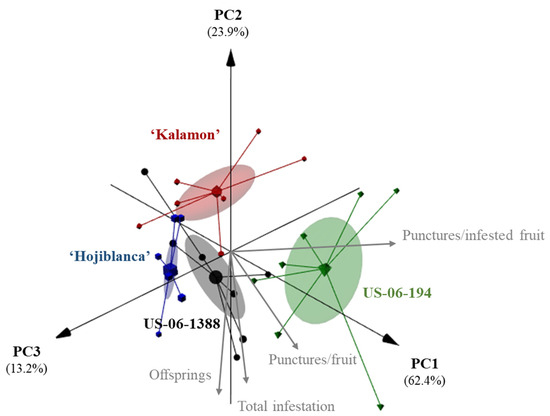 Principal component analysis (3D biplot) based on the behavior of B. oleae (Rossi) in a multiple-choice bioassay of oviposition with four genotypes (PC: principal component function).