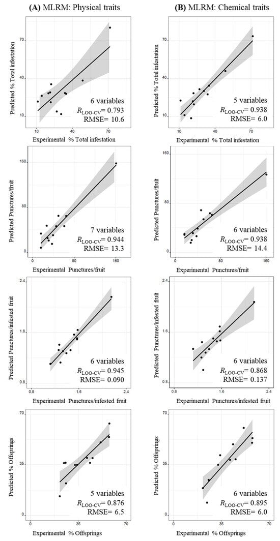 The predictive performance of the developed MLRMs was assessed and the RLOO-CV and RMSE values are shown in Figure 2. The results showed that the MLRMs were able to satisfactorily predict the four variables related to the olive fly’s preference for the fruit (0.793 ≤ RLOO-CV ≤ 0.945).