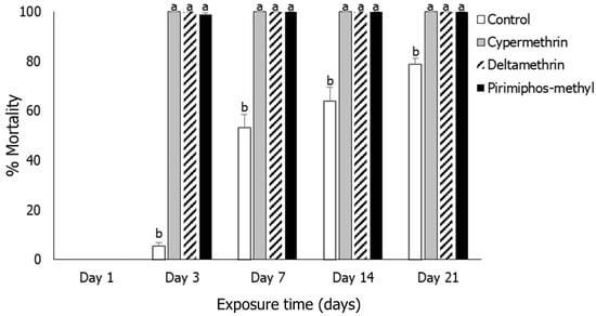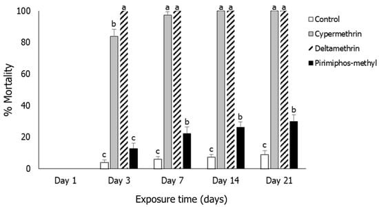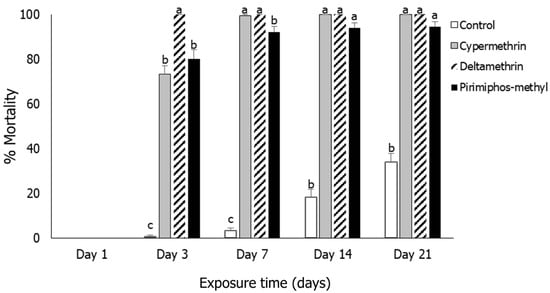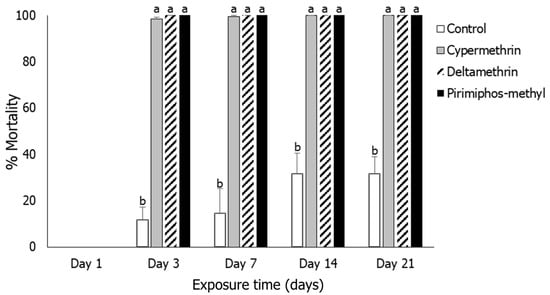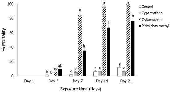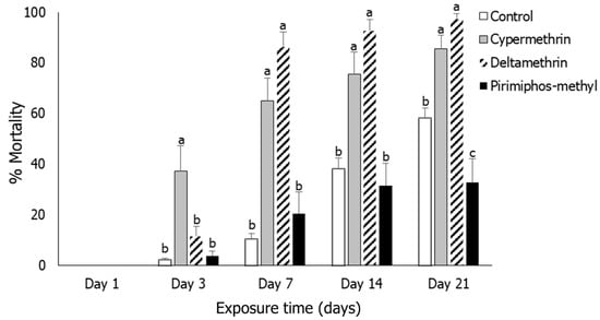 Mortality means (% ± SE) of Sitophilus oryzae adults after exposure for 1, 3, 7, 14 and 21 days to rice treated with three insecticides (cypermethrin, deltamethrin, pirimiphos-methyl and control). Within each exposure interval, means followed by the same lowercase letter did not differ significantly according to the Tukey–Kramer HSD test at p < 0.05. Where no letters exist, no significant differences were noted. ANOVA parameters were noted for Day 3 (F = 62.78, p < 0.001); for Day 7 (F = 62.88, p < 0.001); for Day 14 (F = 59.50, p < 0.001) and for Day 21 (F = 51.59, p < 0.001). On Day 3, the Brown–Forsythe test was utilized (p = 0.394); on Day 7, the O’Brien test was utilized (p = 0.339); on Day 14, the O’Brien test was utilized (p = 0.280); on Day 21, the O’Brien test was utilized (p = 0.159).