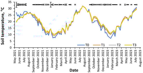 Soil temperature (0–7 cm) during the experiment. Legend: T0, 0 t ha−1; T1, 24.0 and 25.0 t ha−1 in 2021 and 2022; T2, 43.1 and 37.5 t ha−1 in 2021 and 2022; T3, 63.1 and 50.0 ha−1 in 2021 and 2022. Vertical bars represent the least significant differences (p = 0.05) for comparing means (n = 3).