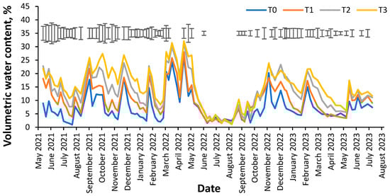 Volumetric water content (0–7 cm) from 2021 to 2023 in Valencia, Spain. Legend: T0, 0 t ha−1; T1, 24.0 and 25.0 t ha−1 in 2021 and 2022; T2, (43.1 and 37.5 t ha−1 in 2021 and 2022; T3, 63.1 and 50.0 ha−1 in 2021 and 2022. Vertical bars represent the least significant differences (p = 0.05) for comparing means (n = 3).