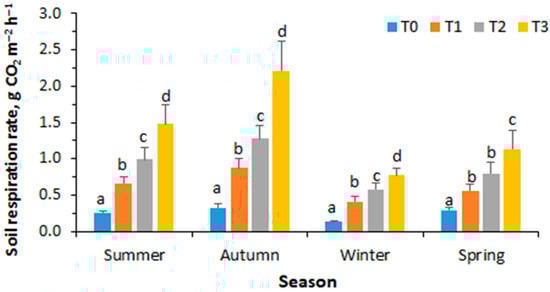 Seasonal values of soil respiration rate (g CO2 m−2 h−1). Legend: T0, 0 t ha−1; T1, 24.0 and 25.0 t ha−1 in 2021 and 2022; T2, 43.1 and 37.5 t ha−1 in 2021 and 2022 T3, 63.1 and 50.0 ha−1 in 2021 and 2022. Same letters over bars indicate non-significant differences according to Fisher’s protected least significant difference test (p < 0.05) to identify significant differences among means for treatment effect (n = 78 for summer; n = 69 for autumn and spring; n = 63 for winter).
