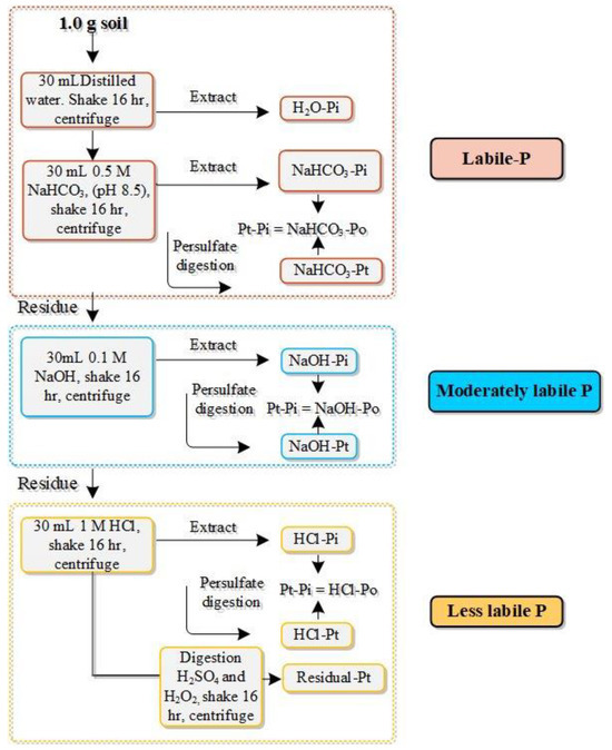 Simultaneously, the fractionation of inorganic P (Pi) and organic P (Po) was determined via a modified sequential extraction method proposed by Tiessen and Moir []. With this procedure, the following fractions were obtained: (i) H2O-Pi, 0.5 M NaHCO3-Pi and Po (labile P); (ii) 0.1 M NaOH-Pi and Po (moderately labile P); and (iii) 1 M HCl-Pi and Po and residual P (less-labile P), mostly composed of stable Ca-bound P (Figure 1).