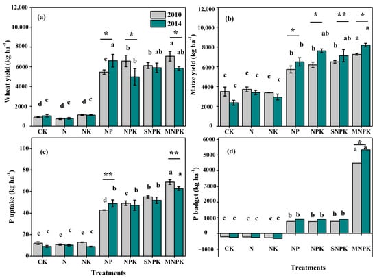 The effects of long-term fertilization on crop yield, P uptake, and P budget determined in 2010 and 2014 are shown in Figure 2. The average grain yield of winter wheat and summer maize under P-fertilized treatments significantly differed between 2010 and 2014 (Figure 2a,b), and P uptake under NP and MNPK treatments also showed significant differences between the two years (Figure 2c). However, the P budget was similar between the two years for all the applied treatments (Figure 2d).