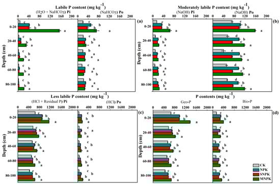 Concentrations of inorganic and organic soil phosphorus pools: labile phosphorus (a), moderately labile phosphorus (b), less-labile phosphorus (c), and geo-biochemical phosphorus (d) in the 0–100 cm profile under different fertilization treatments determined in year 2014. Error bars denote the standard error of the mean. Means followed by different letters within the same depth differ significantly (p < 0.05) between treatments. Abbreviations: Control refers to no fertilizer or manure input (CK); N indicates the treatments that received only synthetic nitrogen fertilizer; NK indicates the treatments that received synthetic nitrogen and potassium (K); NP indicates the treatments that received synthetic nitrogen and phosphorus; NPK indicates the treatments that received synthetic nitrogen, phosphorus, and potassium; SNPK indicates the treatments that received synthetic NPK fertilizers and crop stalk return (S); MNPK indicates the treatments that received incorporation of NPK plus organic manure.