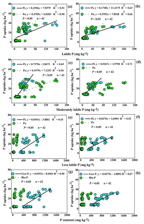 Regression analysis between P uptake by wheat and the Pi and Po components of labile P and moderately labile P showed significant linear relationships (Figure 4a,c). There were also significant and positive correlations between P uptake by the wheat crop and less-labile Pi and Geo-P fractions (Figure 4e,g). In addition, the Pi component of labile P, moderately labile P, less-labile P, and the Geo-P fraction also showed a significant relationship with the P uptake of maize crop (Figure 4b,d,f,h). Moreover, the association between P uptake by summer maize and the labile Po fraction was also markedly and positively correlated (Figure 4b).