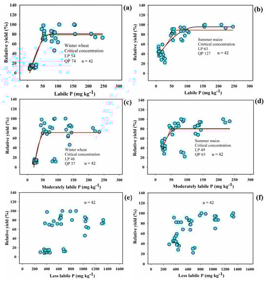 Critical soil P fraction concentrations were determined via linear plateau (LP) and quadratic plateau (QP) models to fit the relationships between relative yield and soil P fractions (labile P, moderately labile P, and less-labile P) []. The critical concentration (CC) determined via LP and QP models are soil P fraction values at which the linear or quadratic portions of each model joined the predicted plateau yield.