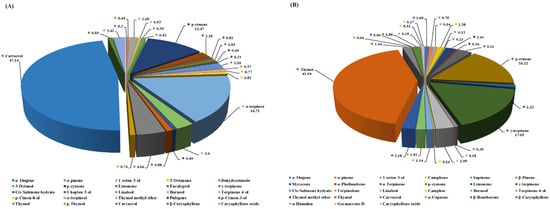 Chemical composition of oregano (Origanum vulgare L.) (A) and thyme (Thymus vulgaris L.) (B) essential oils by GC-MS analysis.