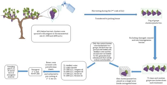 Sixty grapevines approximately uniform in size and free of visible symptoms of infection were sprayed with oregano or thyme essential oils (0, 2000 and 4000 µL/L) and tween-80 as a surfactant 48 h before the clusters were picked during the second week of July in both seasons. Each vine cluster was sprayed until the solution dripped from the fruit. The picked clusters were placed in plastic boxes (5 kg capacity) and transferred by refrigerated vehicle to El-Eman packing house for sorting, packing, cooling, and freezing agricultural crops (Markaz Badr, El-Beheira Governorate, Egypt). Upon arrival, clusters were sorted; damaged and injured berries, as well as non-homogeneous berries, were excluded. After that, 72 clean randomly selected clusters from each treatment were divided into four storage periods (0, 15, 30, and 45 days). Each storage period consisted of three replicates and each replicate contained six clusters. All clusters were placed in polyethylene terephthalate (PET) lid punnet boxes (one cluster/punnet box) with dimensions of 19 × 12 × 8.5 cm. The punnet boxes were placed as a single layer inside corrugated boxes with dimensions of 60 × 40 × 9 cm. Only the control clusters were divided into two groups; the first one was preharvest-treated with distilled water and the second one was treated by SO2 generator dual-release pads that contain sodium metabisulfite (PROTEKU®, Calle C, esquina calle F-03109 TIBI, Alicante, Spain) during the cold storage period. Thus, the experiment included six treatments: (1) control (preharvest-sprayed with distilled water), (2) SO2, (3) 2000 µL/L oregano oil, (4) 4000 µL/L oregano oil, (5) 2000 µL/L thyme oil, and (6) 4000 µL/L thyme oil. All experimental boxes were covered with polyethylene sheets 0.04 mm thick and subjected to pre-cooling by placing them into a forced air-cooling room (pressures 0.6 to 7.5 mbar and air flows 0.001 to 0.003 m3/second/kg) at 2 °C for four hours. After that, the boxes were stored at 1 °C and 90–95% RH for 45 days. The fruits’ physical and chemical characteristics were measured at harvest and then every 15 days from the start of the cold storage period to the end. The experimental procedures are shown in Figure 2.