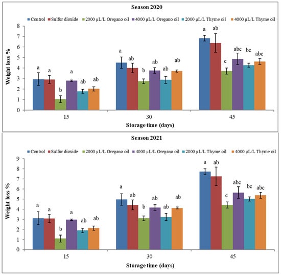 Effect of preharvest applications of oregano and thyme EOs on weight loss (%) of ‘Flame Seedless’ grapes during cold storage at 1 °C. Each value represents the mean ± SE of three replicates. Means followed by the same letters in each season and storage period are not significantly different according to Tukey’s HSD test at p ≤ 0.05.