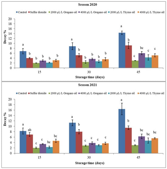 Effect of preharvest applications of oregano and thyme EOs on decay incidence (%) in ‘Flame Seedless’ grapes during cold storage at 1 °C. Each value represents the mean ± SE of three replicates. Means followed by the same letters in each season and storage period are not significantly different according to Tukey’s HSD test at p ≤ 0.05.