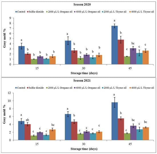 Effect of preharvest applications of oregano and thyme EOs on gray mold (%) in ‘Flame Seedless’ grapes during cold storage at 1 °C. Each value represents the mean ± SE of three replicates. Means followed by the same letters in each season and storage period are not significantly different according to Tukey’s HSD test at p ≤ 0.05.