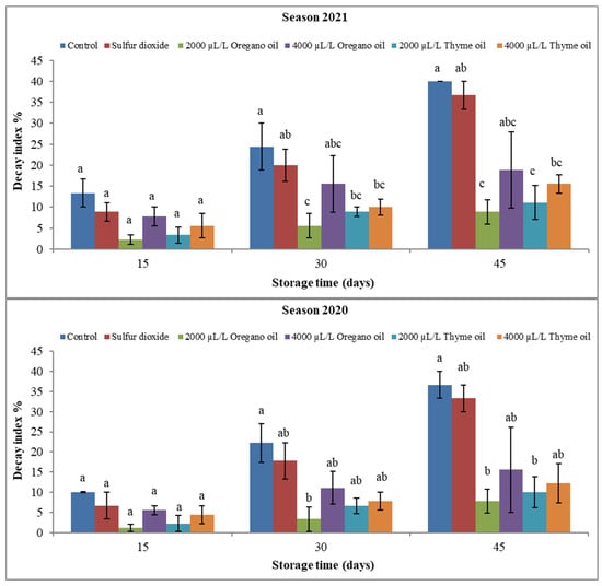 Effect of preharvest applications of oregano and thyme EOs on decay index in ‘Flame Seedless’ grapes during cold storage at 1 °C. Each value represents the mean ± SE of three replicates. Means followed by the same letters in each season and storage period are not significantly different according to Tukey’s HSD test at p ≤ 0.05.