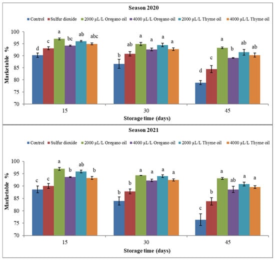 Effect of preharvest applications of oregano and thyme EOs on marketable fruit percentage of ‘Flame Seedless’ grapes during cold storage at 1 °C. Each value represents the mean ± SE of three replicates. Means followed by the same letters in each season and storage period are not significantly different according to Tukey’s HSD test at p ≤ 0.05.