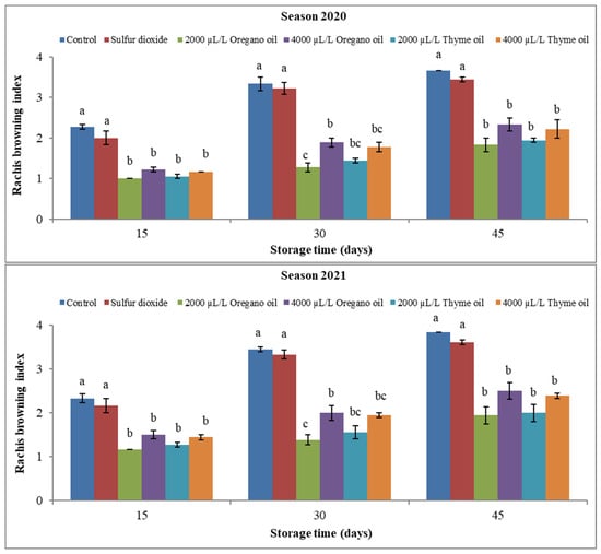 Effect of preharvest applications of oregano and thyme EOs on the rachis browning index of ‘Flame Seedless’ grapes during cold storage at 1 °C. Each value represents the mean ± SE of three replicates. Means followed by the same letters in each season and storage period are not significantly different according to Tukey’s HSD test at p ≤ 0.05.