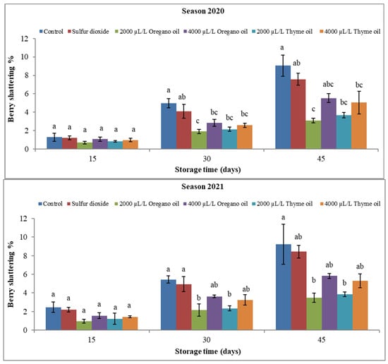 Effect of preharvest applications of oregano and thyme EOs on berry shattering percentage of ‘Flame Seedless’ grapes during cold storage at 1 °C. Each value represents the mean ± SE of three replicates. Means followed by the same letters in each season and storage period are not significantly different according to Tukey’s HSD test at p ≤ 0.05.