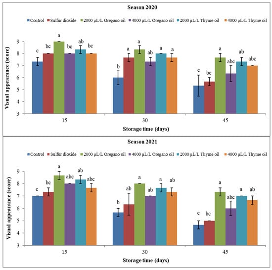 Effect of preharvest applications of oregano and thyme EOs on visual appearance score of ‘Flame Seedless’ grapes during cold storage at 1 °C. Each value represents the mean ± SE of three replicates. Means followed by the same letters in each season and storage period are not significantly different according to Tukey’s HSD test at p ≤ 0.05.