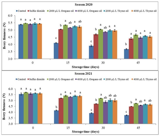 Effect of preharvest applications of oregano and thyme EOs on berry firmness (N) of ‘Flame Seedless’ grapes during cold storage at 1 °C. Each value represents the mean ± SE of three replicates. Means followed by the same letters in each season and storage period are not significantly different according to Tukey’s HSD test at p ≤ 0.05.